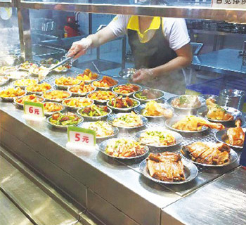 此模式采用對每道菜分別定價方式,分別為1.0元一6.0元不等,例如:青菜 1.0元、茄子1.5元、紅蘿肉片2.0元、辣子雞丁3.0元、紅燒福壽魚4.0元等,所有菜品分別用碟子裝好擺放保溫臺上,用餐人員根據自己喜歡自由選擇消費。