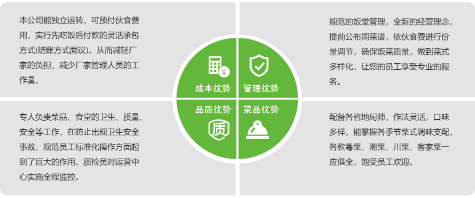 貴公司提前將飯堂就餐的人數以聯絡單的方式或領取飯卡的方式報數給我司,我司按照報餐人數準備飯菜,月底根據聯絡單或飯卡數量與貴司對賬,并按此與貴司結算,我司調派專業廚務團隊人員進行專業廚房操作及管理,為貴公司提供色香味美的膳食服務。